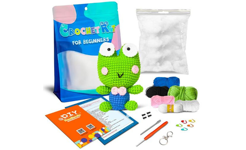 Das All-In-One Häkelanfänger-Set enthält: eine Häkelnadel mit zwei Spitzen, Maschenmarkierer, eine stumpfe Nadel zum Anbringen der Augen, Bastelaugen, weiches Füllmaterial, verschiedene Garne, eine umfassende Anleitung und eine praktische Tragetasche für das gesamte Set.