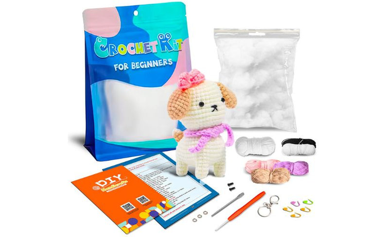 Das All-In-One Häkelanfänger-Set enthält: eine Häkelnadel mit zwei Spitzen, Maschenmarkierer, eine stumpfe Nadel zum Anbringen der Augen, Bastelaugen, weiches Füllmaterial, verschiedene Garne, eine umfassende Anleitung und eine praktische Tragetasche für das gesamte Set.