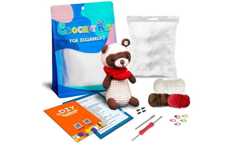 Das All-In-One Häkelanfänger-Set enthält: eine Häkelnadel mit zwei Spitzen, Maschenmarkierer, eine stumpfe Nadel zum Anbringen der Augen, Bastelaugen, weiches Füllmaterial, verschiedene Garne, eine umfassende Anleitung und eine praktische Tragetasche für das gesamte Set.