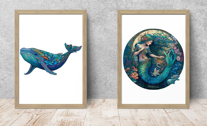 Wenn Sie das Puzzle zusammensetzen, werden Sie auf einzigartige Teile stoßen, die Meerjungfrauen, Pflanzen, Vögel und verschiedene Meeresbewohner darstellen.