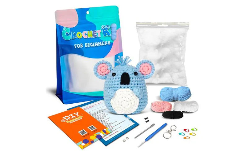 Das All-In-One Häkelanfänger-Set enthält: eine Häkelnadel mit zwei Spitzen, Maschenmarkierer, eine stumpfe Nadel zum Anbringen der Augen, Bastelaugen, weiches Füllmaterial, verschiedene Garne, eine umfassende Anleitung und eine praktische Tragetasche für das gesamte Set.