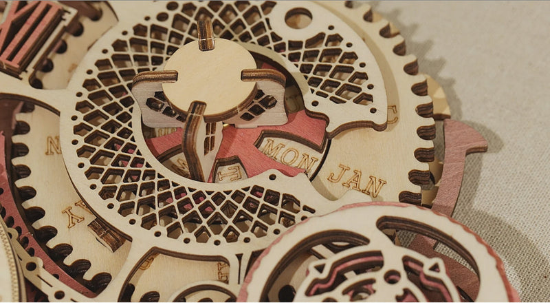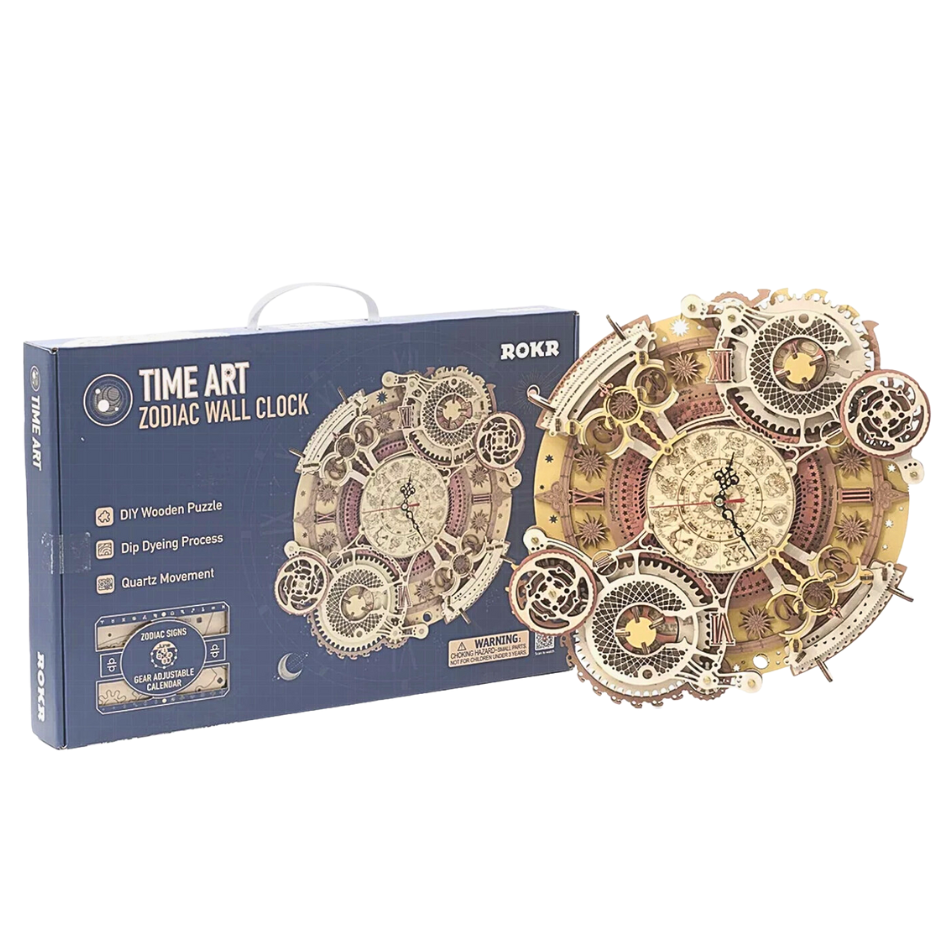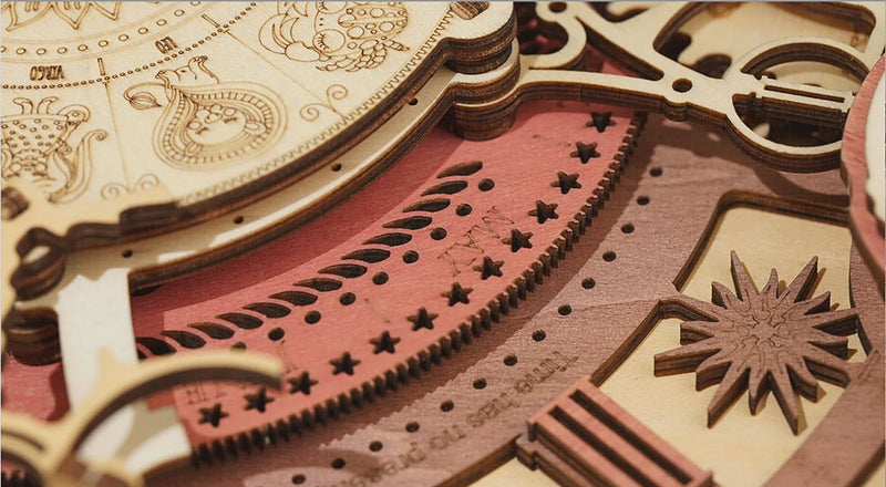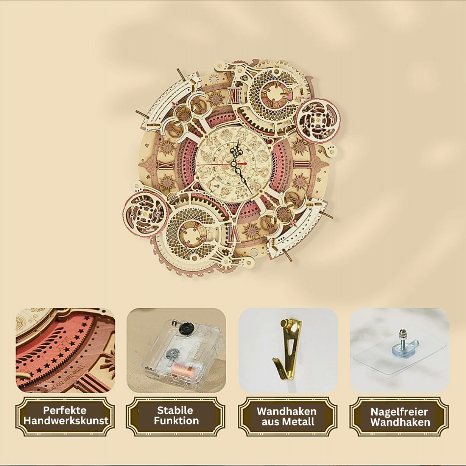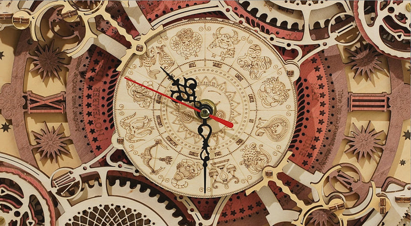 Dieses mechanische Kunstuhr-Holzpuzzle mit Sternzeichen wurde von Miko, einem berühmten europäischen Designer, entworfen, um eine beeindruckende Mischung aus Maschinen und Zeit zu schaffen, die immaterielle Elemente in greifbare Kunstwerke verwandelt. Drücken Sie den entsprechenden Mechanismus, um die genaue Zeit anzuzeigen, genau wie bei einer echten Uhr.
